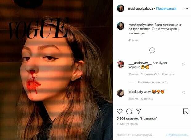 У девушки появились синяки под губой, возле носа и в районе глаза. При этом сама знаменитость сделала несколько снимков, которые попали в видео – все они с разных ракурсов. «Боже, кто это тебя так разукрасил?», «магшот рабочего характера», «ого, вот это да!», - пишут ее поклонники. До этого мы рассказывали, что участь во флешмобе также взяла дочь украинской исполнительницы Оли Поляковой Маша. Уточним, что Мария, несмотря на юный возраст, достаточно активно использует социальные сети, потихоньку достигая уровня своей звездной мамы. Однако в этот раз красотка решила напугать фанатов фотографиями с окровавленным лицом. Так, Маша поделилась фотографией, сделанное под обложку гламурного журнала. При этом на снимке есть одна пугающая деталь: из носа школьницы идет кровь. Очевидно, что снимок был отредактирован, хотя сама Маша и уверяет, что кровь настоящая. «Блин месячные не оттуда пххпхп. О и кстати кровь настоящая», - подписала фото девушка. Напомним, дочь Кравец из "Квартал 95" расстегнула рубашку и показала свои джунгли. Как сообщала Politeka, юная дочь Кравец из "Квартал 95" превратилась в копию Ани Лорак после смены имиджа. Также Politeka писала, что Елена Кравец из "Квартал 95" ошарашила признанием о юной дочери.