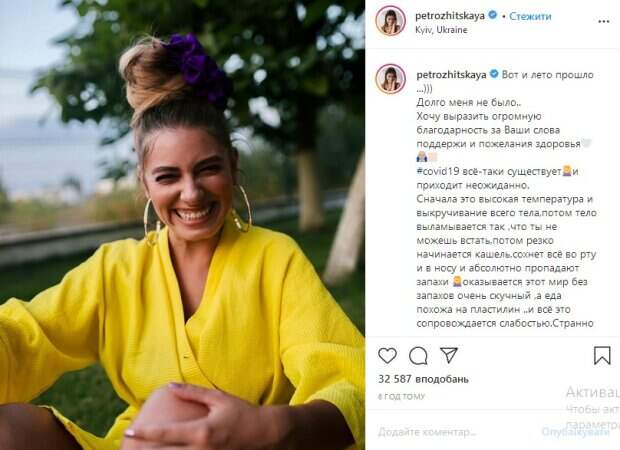 После этого подключились и другие, характерные этой болезни симптомы. «Сначала это высокая температура и выкручивание всего тела, потом тело выламывается так, что ты не можешь встать, потом резко начинается кашель, сохнет все во рту и в носу и абсолютно пропадают запахи. Оказывается этот мир без запахов очень скучный, а еда похожа на пластилин. ..и все это сопровождается слабостью», - отметила она. В то же время Петрожицкая рассказала, что сейчас ее самочувствие уже лучше, но обоняние не успело полностью восстановиться. Также ей до сих пор сложно дышать. Что касается участия шоу, то актриса уверена, что вернется на паркет после того, как у нее будет негативный ПЛР-тест. Кроме того, она поблагодарила своих поклонников за поддержку. Напомним, что ведущая вслед за Мейхер и Винником ошарашила решением по "Танцям з зірками", страсти накаляются: "Зачем?". Как сообщала Politeka, Ольга Фреймут неожиданно отправила свою трехлетнюю дочь в школу: "Интересный подход". Также Politeka писала, что горячая украинская телеведущая в мини-юбке засветила лишнее, выходя из машины: "А Верка Сердючка не так показывала".