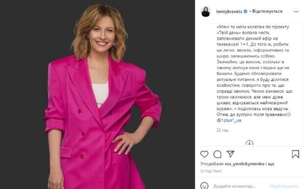 В своем микроблоге в Instagram телезвезда рассказала подробности, опубликовав очаровательное фото в ярком наряде. "Ну все, уже можно. Делюсь с вами новостью!", - заинтриговала звезда. На новом снимке Елена появилась в ярко-розовом удлиненном пиджаке, под которым видно белую кофточку, ее волосы аккуратно уложены, а на лице легкий макияж и милая улыбка. Актриса рассказала, что стала одной из ведущих нового шоу на телеканале "1+1", которое выйдет в эфир уже 24 мая. По словам Кравец, она очень волнуется, так как для нее это совершенно новый опыт, но в то же время пообещала зрителям много всего интересного. "Конечно, это вызов, поскольку в таком амплуа меня зрители еще не видели. Будем обсуждать актуальные вопросы, я буду делиться личным, говорить о том, что действительно волнует. Честно признаюсь, что немного волнуюсь, но мне очень интересно, чувствуется невероятный кураж", - поделилась актриса. Стоит отметить, что в новом шоу на известном телеканале всего будет шесть ведущих, а Елена Кравец будет появляться в эфире по четвергам. Напомним, Елена Кравец устроилась на новую работу, что известно: "Лучше бы она вернулась в Женский квартал". Как сообщала Politeka, Елена Кравец с огромным букетом показала, как выглядит в обычной жизни: "Пример для подражания". Также Politeka писала, Кравец из "Квартал 95" тайно сняла свою маму и деталь ремонта в квартире родителей: неожиданные кадры.