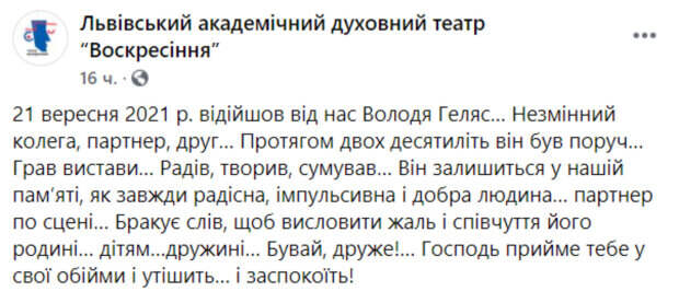 Сердце украинского артиста перестало биться на 58 году жизни Накануне, 21 сентября, не стало актера Львовского академического духовного театра "Воскресение" Владимира Геляса. Об этом сообщили на Facebook-странице театра. Коллеги отметили, что актер навсегда останется в их памяти, как всегда радостный, импульсивный, добрый человек и партнер по сцене.