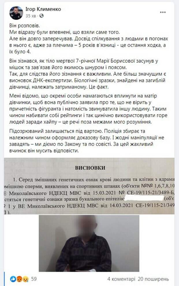 "Он признался, как тело мертвой 7-летней Марии Борисовой засунул в мешок и завязал его каким-то шнуром и поясом. Да, для следствия его признание важно. Но более значимым является вывод ДНК-экспертизы. Биологические образцы, найденные на погибшей девочке, принадлежат задержанному. Это факт", – написал он. Глава Нацполиции также сообщил, что кто-то пытается повлиять на мать девочки, чтобы она публично заявила о том, что не верит в причастность фигуранта и обвинила другого человека. Подозреваемый остается под стражей. На данный момент полиция собирает и оформляет доказательную базу. Напомним, Маша пропала 7 марта, отпросившись вечером у мамы погулять на улице. Когда дочь не вернулась, женщина подняла на уши все село и полицию, в этот же день начались масштабные поиски ребенка. Труп девочки обнаружили 11 марта в сарае. Она была завернута в полиэтиленовый мешок, завязанный лентой. В полиции заявили, что на теле девочки были следы насильственной смерти и изнасилования. Вероятно, ребенка душили. Полиция задержала подозреваемого 14 марта. когда полицейские пришли в дом предполагаемого преступника, тот лежал с порезанными венами. Мужчину спасли, чтобы он мог предстать перед судом. По словам односельчан, мужчина уже совершал подобное преступление прямо в этом селе. Напомним, подозреваемый в трагедии с Машей Борисовой держал в страхе село и пугал детей. Как сообщала Politeka, всплыли новые детали расправы над Машей Борисовой. Также Politeka писала, что полиция показала фото подозреваемого в убийстве Маши Борисовой: "Проведены генетические экспертизы"