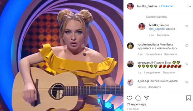 Платье было коротким, поэтому Булитко хвастнула своими стройными ножками. Кроме этого, приспущенный наряд позволил оголить плечи и зону декольте звезды. Образ дополнила забавная прическа, которая превратила Вику в игривую молодую девушку. Булитко сидела на высоком стульчике, играла на гитаре и пела, демонстрируя все, на что способна. В комментариях под постом стали обсуждать удачный образ актрисы. «Мне Вика нравится, я в неё влюбилась», «Ты не девушка- война», «Привет Вика», «Какая женщина», «Ясное солнышко», «Эксперимент удался!», - пишут пользователи сети. Как известно, Виктория Булитко одна из ведущих актрис «Дизель шоу». Она занята в проектах студии с 2015 года. В 2019 году артистка стала участницей шоу «Танцы со звездами», в котором заняла третье место. 38-летняя Виктория активно снимается в украинских фильмах и сериалах. Она заявляет о себе как о комедийной актрисе. Напомним, что Булитко из "Дизель Шоу" пошалила с "подружкой" на столе в приоткрытом халате: "Мы хотим...". Как сообщала Politeka, Булитко навела красоту в неожиданном месте: "Проснулся? Умойся! Почисти зубки и...". Также Politeka писала, что Булитко превратилась в роковую красотку с бездонным декольте: "Наравне с Белуччи".