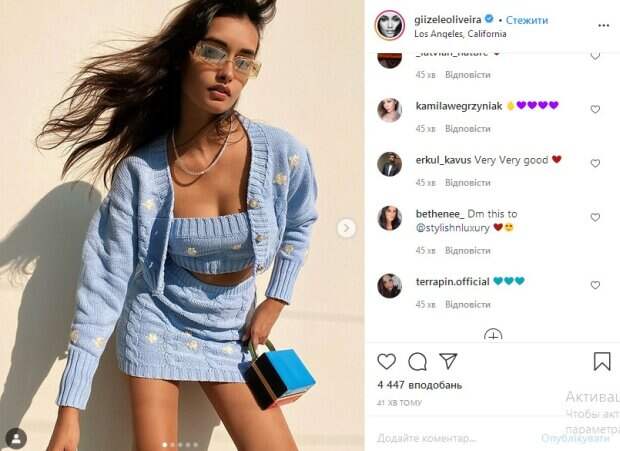 Также можно заметить, что красотка немного вспотела под лучами осеннего солнца. «Какая красивая», «великолепно выглядишь», «ох, этот взгляд», «видно, что жарко. Аж вспотела», «самая красивая. Во всем мире», «это чертовски мило», «принцесса», «очень и очень крутая», - пишут ее поклонники. До этого сообщалось, что бразильская модель Жизель Оливейра, которая является звездой Victoria’s Secret, примеряла роль школьницы-бунтарки Модель была одета в короткую плиссированную юбку, блестящий топ и красивый строгий пиджак. Образ она дополнила массивными туфлями и сумочкой в виде сердечка. Стоит отметить, что выглядела звезда Victoria’s Secret превосходно. От ее длинных стройных ног невозможно отвести взгляд. За 20 минут пост красотки оценили почти 4 тысячи человек. В комментариях ей оставили массу приятных слов. Напомним, что Жизель Оливейра изумила видом сзади в крохотных шортах: «Черная пантера». Как сообщала Politeka, Жизель Оливейра побаловала сочным видом в бикини: «Афродита». Также Politeka писала, что Жизель Оливейра поиграла бюстом на камеру, застыв в неприличной позе: жаркие кадры.