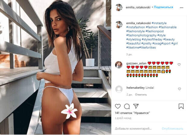 Теперь в Инстаграм на фан-аккаунтах появляются самые разные фото из фотосессий девушки, тогда как сама она показывает лишь домашние фото в Сториз. На одном из фото девушка позировала у пляжного домика, привычно выставив ягодицы на показ и повернувшись к объективу спиной. Девушка дополнила пляжный лук белой тонкой майкой и привычно распустила волосы. Как и всегда, на ее лице не было макияжа. Вот как реагируют в сети: «Милый образ!; всегда влюбляет себя