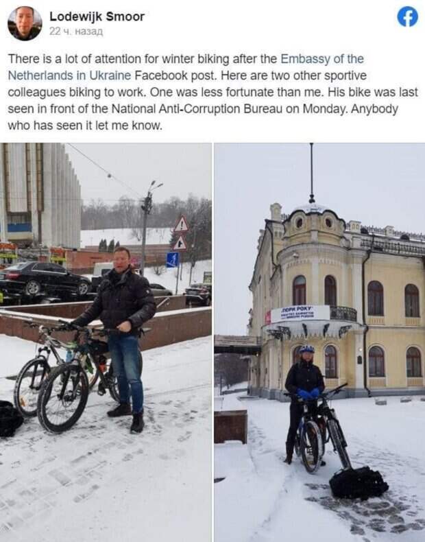 В Киеве у нидерландского дипломата украли велосипед Об этом сообщает Politeka со ссылкой на dtp.kiev.ua. Так, первый секретарь посольства Королевства Нидерландов в Украине Лодевейк Смоор рассказал в соцсети, что сам ездит каждый день на работу на велосипеде, однако одному из его коллег "повезло меньше".