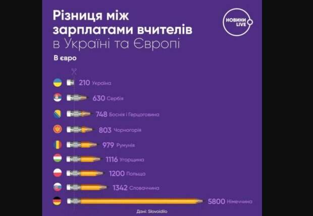 В Украине недавно отметили День учителя По таком поводу в портале "Новини.Live" решили поделиться красноречивой инфографикой, в которой можно увидеть, сколько зарабатывают украинские учителя и их европейские коллеги. Судя по данным, украинские учителя зарабатывают 210 долларов, то есть примерно 6 400 грн, в Сербии зарплата у преподавателей выше 630 долларов (19 400 грн), в Польше - 1200 (37 000 грн) , а в Германии учителя получают и вовсе космические суммы - 5800 (179 000 грн).