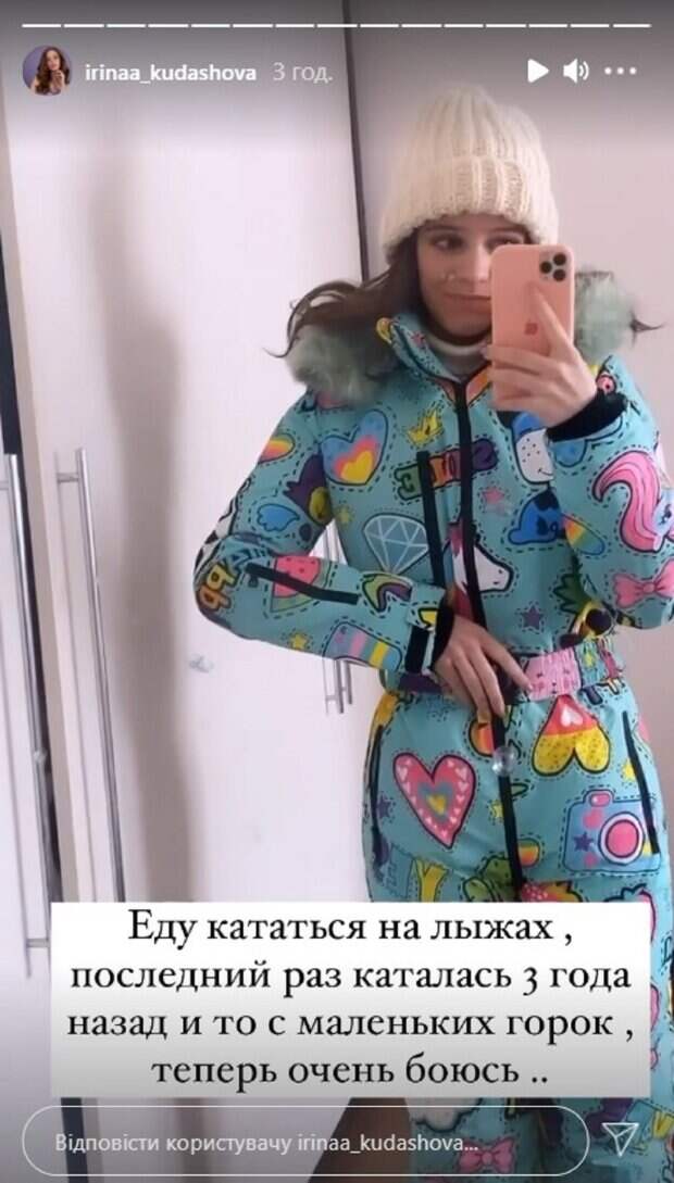 Известная украинская актриса Ирина Кудашова, любимица Михаила Поплавского из сериала "Школа", показала свежий образ в лыжном костюме. На фото красотка позировала в нежно-голубом комбинезоне с милым принтом в сердечках, мультяшных бриллиантах и пони. Ирина дополнила образ белой вязанной шапочкой. Звезда стояла перед зеркалом и смотрела в смартфон.