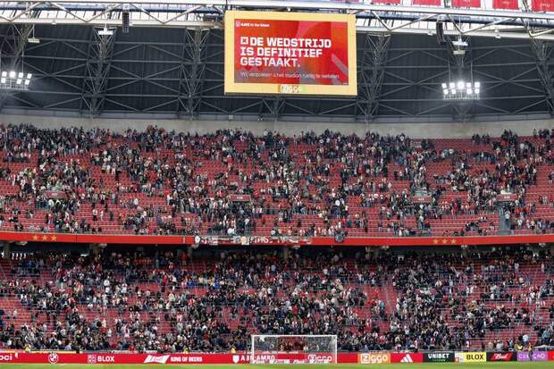 Центральная встреча шестого тура чемпионата Нидерландов по футболу между «Аяксом» и чемпионом страны «Фейеноордом» была прервана во втором тайме на 56-й минуте при счете 3:0 в пользу гостей. Группа разгневанных фанатов амстердамского клуба, недовольная слабой игрой своего клуба, сначала попыталась прорваться на поле, а затем забросала газон пиротехникой.