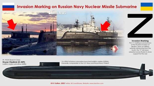 Западные наблюдатели заметили российскую подводную лодку «Князь Владимир» класса «Борей-А», оснащенную баллистическими ракетами, с буквой Z на борту. Об этом сообщило французское издание Naval News со ссылкой на ряд источников.