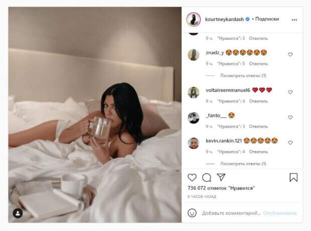 Известная модель Кортни Кардашьян показала себя и рассказала о чаепитии На фото звезда позировала в ночной рубашке, лежа на простынях на роскошной кровати. В руке Кортни держала чашку с чаем, которой пригощалась. Девушка решила волосы оставить распущенными, а время провести за книгой, которая лежала рядом.