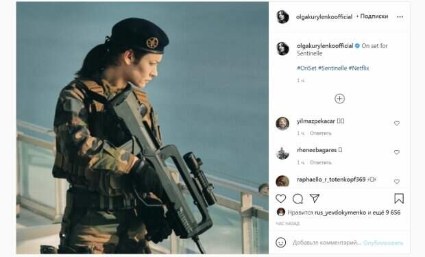 Ольга позировала в военной форме и берете, а в руках держала винтовку. Вид у артистки был серьезным. В таком образе Куриленко появилась в боевике "Sentinelle", снятом компанией "Netflix". Известно, что в картине актриса исполнила роль французского солдата, который вернулся из зоны боевых действий к мирной жизни. Героиня патрулирует улицы, не зная, где ей применить смертоносные навыки, но позже случай с сестрой все меняет. Указанный кадр был сделан во время съемки фильма, о чем Куриленко сообщила в подписи. За час публикация собрала более 8000 лайков и много комментариев. «Отличный фильм», «Очень понравился этот фильм ❤️», «Браво», "Очень хороший фильм", "Я смотрел, и мне понравилось ... !!!", "Черная вдова на самом деле?", "Какая просто потрясающая фотография
