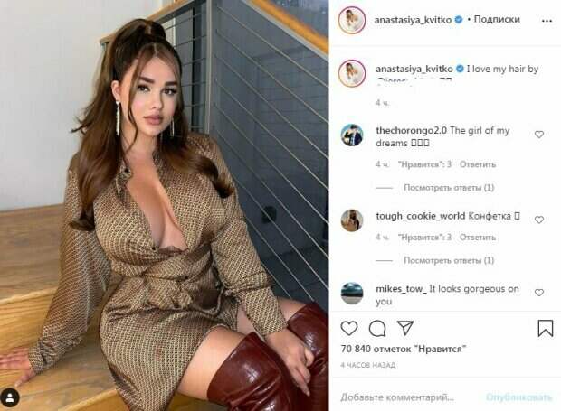 Девушка, как можно заметить, гуляла у реки. Об этом пишет Politeka.net со ссылкой на страничку знаменитости. Фанаты поставили почти 5 тысяч лайков и написали комментарии: "Красивая", "Красивая моя любовь", "Я скучаю по тебе моя русская королева", "Красивая дама, целую, Анастасия", "ты мне нравишься", "Ты самая красивая из всех, очень хорошенькая", "Очень хорошо. И домашнее животное", "У меня такая же собачка, но черная", "Как бы я хотел, чтобы я был тем щенком, чтобы она меня несла", "Ваша собака померанский шпиц", "Пожалуйста, родите не менее 10 детей", "позвольте мне позаботиться о вас и ваших животных, а теперь скажите вашему мужа, что я не разобью вам сердце и не подведу вас здесь". Сообщалось, что известная модель Анастасия Квитко похвасталась большой грудью в смелом платье. Так, Квитко в этот раз надела шелковое платье с пуговицами, которые расстегнула. Из распахнутой одежды выставилась большая грудь без белья. Такая деталь привлекала внимание и не посмотреть в декольте просто невозможно. Напомним, русская Кардашьян в непристойном декольте с трудом удержала бюст шестого размера А еще Politeka писала, что русская Кардашьян восхитила видом у фонтана в золотом топе Также Politeka сообщала, что русская Кардашьян обмазала лосьоном свое богатство в неприличном декольте