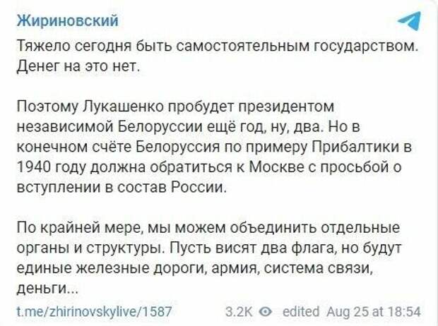 Об этом скандальный политик написал в своем Телеграм-канале. "Тяжело сегодня быть самостоятельным государством. Денег на это нет. Поэтому Лукашенко пробудет президентом независимой Белоруси еще год, ну, два. Но в конечном счете Белорусь по примеру Прибалтики в 1940 году должна обратиться к Москве с просьбой о вступлении в состав России", – отметил он. По словам политика, как минимум можно объединить отдельные органы и структуры. "Пусть висят два флага, но будут единые железные дороги, армия, система связи, деньги..." – добавил Жириновский. Также ранее сообщалось, что Владимир Жириновский предложил сценарий с вхождением Беларуси в состав РФ. По его "грандиозному" плану, Беларусь может войти в состав России в качестве шести областей. При этом Жириновский нашел правильное "применение" для президента Беларуси и предлагает сделать Александра Лукашенко вице-премьером РФ по сельскому хозяйству. Напомним, что Жириновский в приступе истерики «уменьшил» Украину до трех городов. Как сообщала Politeka, Жириновский нашел виновных всех бед России в Украине и поплатился. Также Politeka писала, невменяемый Жириновский нашел нового врага на карте мира.