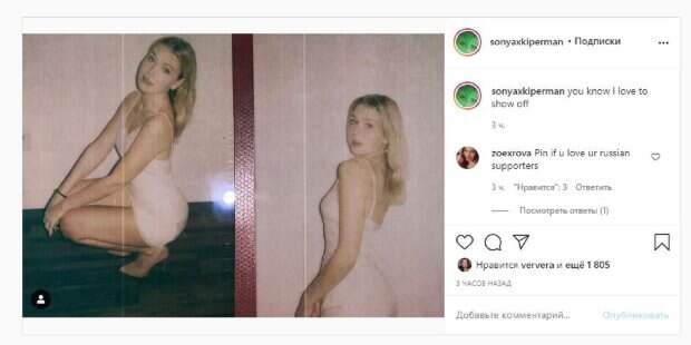 Дочь украинской певицы Веры Брежневой, которая давно живет и строит карьеру в России, Соня Киперман показала себя в нежном образе На фото Киперман позировала в белом платье и без белья. Красотка на одном фото присела, выпятив пятую точку, а на втором - развернулась боком, хвастаясь безупречными изгибами.