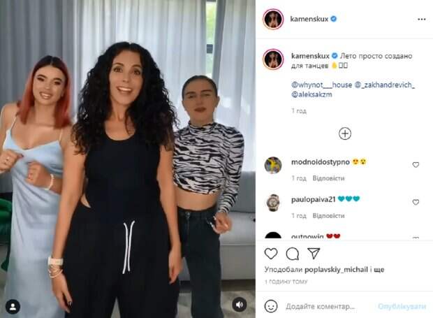 Как видно, девушки запечатлены в светлой комнате, они синхронно двигаются под ритмичную музыку, явно кокетничая с фолловерами. Настя появилась перед камерой в спортивном образе – на ней черные брюки и облегающий темный топ, этот наряд подчеркнул изящную фигуру певицы. Ее пышные кудрявые волосы распущены и аккуратно уложены, а на лице легкий макияж и игривая улыбка. девушки рядом с ней в более ярких образах – одна в длинном голубом платье на тонких бретельках, а вторая в полосатой кофточке и джинсах, у обеих на лицах яркий макияж. В подписи к публикации Каменских написала: "Лето просто создано для танцев". Пользователи тут же принялись активно обсуждать новое видео артистки, засыпая девушек комплиментами в комментариях: "Красотка", "Классная, красотка!", "Беременная", "Баба Настя!", "Ну что, друзья, ждём пополнение, да?", "Смотрю на вас, и душа радуется! Вы такой искренний и настоящий человек!", "Круто", "Супер танцы", "Главное правильное выражение лица", "Песня нашей юности, вы прекрасны", "Какая красивая". Напомним, Могилевская поздравила Каменскую с праздником, заговорив о детях: "Маленьких Потапчиков....". Как сообщала Politeka, 34-летняя Каменских в свой день рождения превратилась в копию жгучей мексиканки: "Какой Потап везунчик". Также Politeka писала, Потап, не сдерживая эмоций, обратился к Каменских после сцен ревности и прощания: "Тысячи тропинок в рай...".
