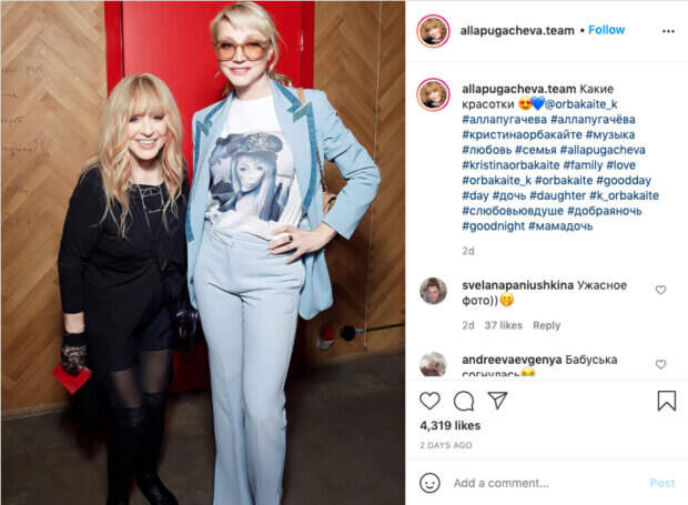 Также у Аллы Пугачевой есть знаменитая дочь - Кристина Орбакайте. Они активно ведут социальные сети и делятся с поклонниками моментами из жизни. На этот раз на одном из фан-аккаунтов Аллы Пугачевой в Инстаграме появилось новое фото. На снимке Алла Пугачева и Кристина Орбакайте вышли вместе на публицу. Кристина в ярком голубом классическом костюме, а Алла вся в черном. Пользователи сети негативно отреагировали на увиденное, и отметили то, как женщины постарели: "Ужасное фото", "Бабуська согнулась", "Очень неудачное фото", "Ни одна на себя не похожа...", "Баба Яга и костяная нога", "Очень неудачное фото. Не надо показывать такую разницу в росте. Так и хочется сказать: Торопунька и Штепсель". Ранее сообщали, 50-летняя дочь Пугачевой Орбакайте засветилась в шелковом халате: «Стиль и чувство вкуса» Также, Галкин показал, как проводят время их с Пугачевой дети в замке: "Милота с небольшой хитрецой" Politeka рассказывала, вид Пугачевой до пластики рядом с Галкиным ошеломил сеть, красноречивые кадры: «Как бабушка с внуком»