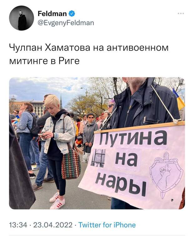 Уехавшая из РФ после начала операции на Украине актриса Чулпан Хаматова выступила на антироссийском митинге в Риге. «Сегодня, как и многие люди, я чувствую невероятную боль, с которой невозможно справиться, представить себе, что чувствуют сегодня украинцы… Это какое-то искажение реальности, в которое попала моя Родина.