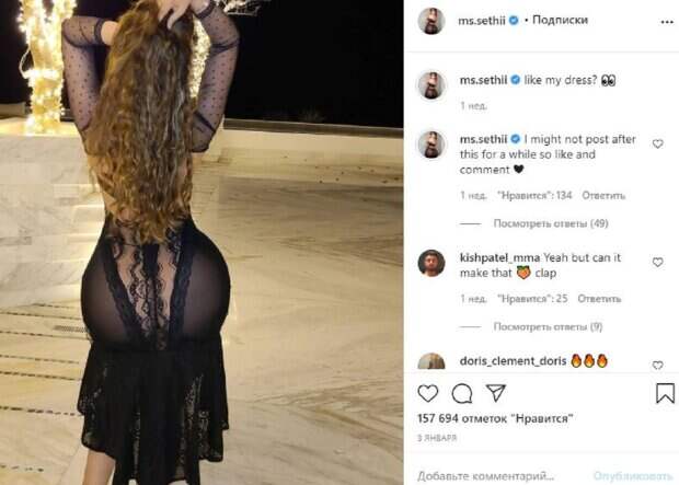 Об этом пишет Politeka.net со ссылкой на страничку знаменитости. На фото Шилпа позирует в черном прозрачном платье, развернувшись спиной. Сетхи взялась руками за волосы, хвастаясь эффектными формами, которых совсем не смущается. "Нравится мое платье?", - написала звезда. Фанаты поставили более 150 тысяч лайков и написали комментарии: "Да, но может ли это сделать", "сегодня вечером для развлечения", "Я отказываюсь верить, что это издает неприятные запахи", "можете ли вы отреагировать на мой комментарий таким образом, чтобы я увидел, что мой 2021 год сделан, люблю тебя", "Можно сегодня увеличить картинку?", "Я вижу твою красоту", "Я одинок, мне действительно нужна девушка", "Мечта любого парня", "Ты настоящая девушка, хотя". На втором фото Шилла уже стояла в топе и шортиках. Девушка акцентировала внимание на пышных ягодицах, которые были максимально обтянуты нарядом. Кадр получился зажигательным и манящим, так как Сетхи обожает себя показывать. Напомним, русская Кардашьян распахнула халат и показала, какие "пышки" прячет в бикини А еще Politeka писала, что турецкая Кардашьян обескуражила крупными формами в розовом боди Также Politeka сообщала, что русская Кардашьян повиляла знаменитыми ягодицами в красных стрингах