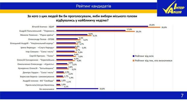 Фаворитами киевлян в борьбе за должность мэра столицы стали нынешний градоначальник Виталий Кличко и общественный деятель Андрей Пальчевский Такие результаты показало новое исследование ОО "Центр общественного развития "ИНТЕР-АКЦИЯ", проведенное с 5 по 7 сентября в Киеве. Всего опрошено 1500 респондентов.