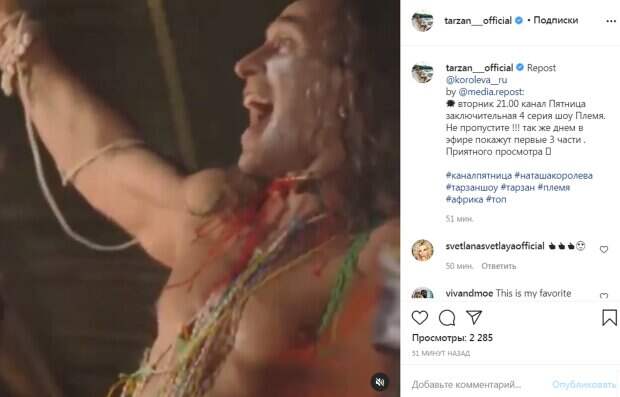 Известный российский артист и муж певицы Наташи Королевой Тарзан анонсировал премьеру шоу, в котором приняла участие звездная пара Об этом сообщает Politeka со ссылкой на страницу Тарзана в соцсети. Так, Сергей Глушко, известный как Тарзан, опубликовал в своем аккаунте фрагмент видео, на котором он с Королевой выясняет отношения - очевидно, именно это стало темой шоу "Племя".