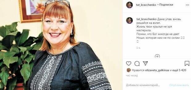 Так, на одном из последних фото Кравченко появилась в черной рубашке с белой вышивкой. Звезда не делала себе укладку, и уложила волосы за уши. На голове артистки можно заметить очки для зрения. Яркая актриса улыбалась, глядя в объектив камеры. "Даже упав, вновь решайся на взлет, Жизнь твои крылья не зря мастерила. Помни, что Бог никогда не дает ноши, которая нам не по силам