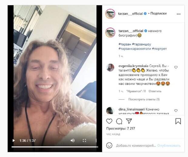 "Всем привет. Хочу всех поблагодарить за теплые отклики о моих работах. Мне очень приятно, что это нравится еще кому-то. Вот, хочу ответить на вопрос по поводу образования. У меня все спрашивают, есть ли образование художественное. Я закончил в детстве детскую художественную школу. Все. На этом художественное образование закончено мое. Я по жизни люблю рисовать и в детстве очень любил. Потом когда учился в академии военной, тоже рисование. Я всегда был во всех этих коллегиях, там рисовал портреты, но я любил графику. Я усаживал друзей военных и рисовал их. Потом рисовал портреты их девушкам, потому что у курсантов не было денег на подарки и таким образом выкручивались. Вот, а потом был период, когда больше 20 лет я даже карандаша в руки не брал. Почему это произошло - я не знаю ответа на этот вопрос. Я сам себе не могу ответить, не хотелось. А мне хочется и получается лишь тогда, когда я хочу. Я должен захотеть то, что я нарисую. Тогда случаются чудеса. Всем привет", - сказал Сергей. "Немного биографии", - написал Тарзан. Фанаты посмотрели видео тысячи раз и написали комментарии: "Сергей, Вы - талант!!! Желаю, чтобы вдохновение приходило к Вам как можно чаще и Вы радовали нас своим творчеством", "Конечно нравиться, второго Тарзана нет, я вообще бы скульптуру Тарзана изваяла и мы могли бы покупать и украшать интерьеры. У меня на трассе Венера и Давид. Во я Флоренции купила. Я кстати это серьёзно". Напомним, Тарзан показал, на что вдохновила его Наташа Королева в платье с разрезами до бедра А еще Politeka писала, что сын Королевой и Тарзана окунулся в холодную воду в плавках и нарвался на неудобные вопросы Также Politeka сообщала, что муж Королевой Тарзан понежился на солнце, удивив постаревшим видом
