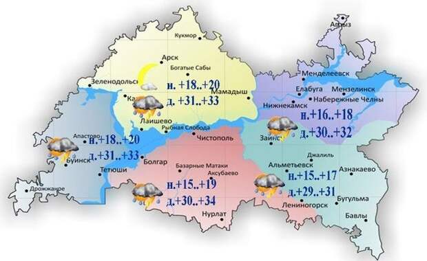 Во вторник, 12 июля, в Татарстане прогнозируется переменная облачность. Местами кратковременный дождь, гроза, днем локально град. Максимальная температура воздуха днем в Татарстане составит от +29 до +34 градусов. В Казани ожидается от +31°С до +33°С. В Набережных Челнах синоптики прогнозируют от +30 до +32 градусов.