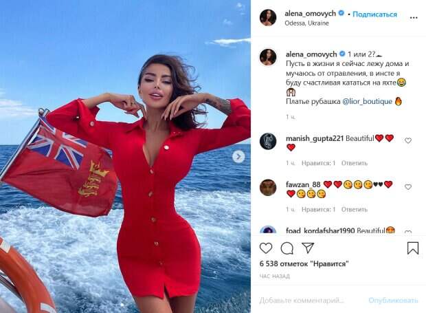Известная украинская модель Алена Омович впечатлила формами в откровенном наряде на борту яхты Красотка, прославившаяся как «украинская Кардашьян», порадовала поклонников новыми соблазнительными фото в своем Инстаграм. Об этом пишет Politeka.net. Так, Омович поделилась архивными фотографиями, на которых она томно позирует на борту яхты в платье-рубашке ярко-красного цвета.