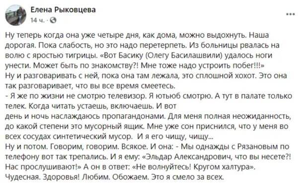 Как известно, ранее в СМИ появлялась информация о том, что женщина была госпитализирована, но позже она опровергла это. Как оказалось, Ахеджакова намеревалась сбежать из медучреждения, о чем Рыковцева написала в своем аккаунте. Стало известно, что российскую актрису выписали еще несколько дней назад, и она пока что чувствует слабость. Журналистка рассказала, что Ахеджакова из больницы "рвалась на волю с яростью тигрицы". "Вот Басику (Олегу Басилашвили) удалось ноги унести. Может, по знакомству?! Мне тоже надо устроить побег!" - цитирует журналистка Ахеджакову. Также, по ее словам, Ахеджакова поделилась своими впечатлениями о регулярном просмотре телевидения во время пребывания в больнице. Она подчеркнула, что в жизни телевизор вообще не смотрит - только YouTube. Но в больнице приходилось включать телевиор, когда уставала читать. "Когда читать устаешь, включаешь. И вот день и ночь наслаждаюсь пропа****онами. Для меня полная неожиданность, до какой степени это мусорный ящик. Мне уже сон приснился, что у меня во всех сосудах синтетический мусор. И я его чищу, чищу", - рассказывала актриса. Напомним, что Ахеджакова вывела на чистую воду пропагандистов Кремля. Как сообщала Politeka, Жириновский нашел виновных всех бед России в Украине и поплатился. Также Politeka писала, Соловьев вычеркнул Украину из истории, безумное заявление попало на камеру.