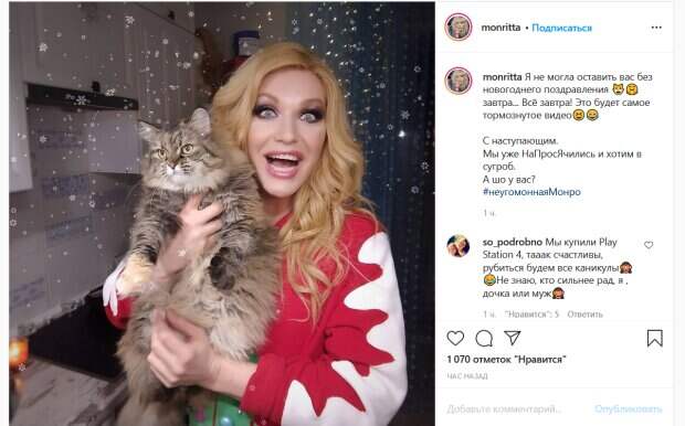 .. Всё завтра! Это будет самое тормознутое видео. С наступающим. Мы уже НаПросЯчились и хотим в сугроб. А шо у вас?», - написала Монро. На фото артистка позирует в домашней одежде и с возбужденным выражением на лице. В руках Монро держит своего пушистого любимца – кота. Судя по выражению его морды, он предпочел бы, чтобы хозяйка его отпустила. Для придания снимку праздничной атмосферы звезда добавила эффект в виде белоснежных снежинок. Поклонники знаменитости тут же отреагировали на ее пост. «А я верю, что когда-нибудь Вас встречу и мы пообщаемся лично», «Выжили и слава Богу», «Все в подготовке, под просмотр "один дома", Монритта, с наступающим!», «Монритта! Всяческих удач и побед! Любопытства и энергии! Сугробов по желанию и по волшебству!», «Монритта, красотка! С Наступающим», «Какой котик прелесть», «У нас в Крыму +15, летний Новый год!!! Очень хочется снега.С наступающим!!!! Всех благ!», - пишут люди. Напомним, травести-дива Монро ошарашила смелым фото у шеста в дерзком наряде: «Круче только Мадонна». Как сообщала Politeka, травести-дива Монро в новом образе напомнила Ирину Билык в лучшие годы. Также Politeka писала, что травести-дива Монро с пухлыми губками заткнула за пояс молодых красоток: «Символ природного шарма».
