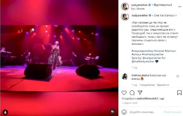 Надежда выступила с камерным оркестром на сцене, исполнив песню шикарным бархатным голосом. Свое віступление Надя прокомментировала цитатой Рихарда Вагнера: "Как человек до тех пор не освободится, пока не примет радостно узы, соединяющие его с Природой, так и искусство не станет свободным, пока у него не исчезнут причины стыдиться связи с жизнью", - написала звезда. Надежда выступила в ярком блестящем наряде, в окружении ярко-малиновой иллюминации софитов. "Классная как всегда