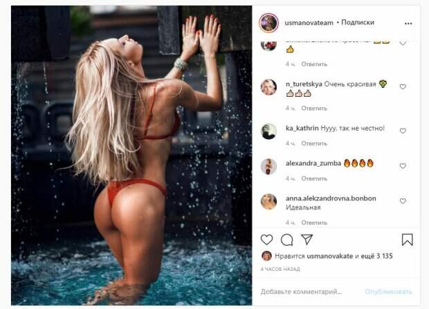Известная модель и фитнес-тренер Екатерина Усманова показала себя на отдыхе На фото Усманова позировала в красном бикини. Красотка стояла в воде, развернувшись спиной. Волосы у Екатерины были распущенными, а на руке можно увидеть украшение. Кадр получился очень соблазнительным и горячим, ведь фитнес-тренер сверкнула загоревшими "булочками".