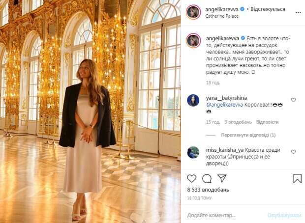 «Каждый раз я вижу тебя в новых красках.. у нас с тобой роман.. Святой Пётр (Санкт-Петербург)», - подписала Анжелика, намекнув, что крутит роман с этим прекрасным городом. Стоит отметить, что Ревву пустили во дворец, где она сделала несколько восхитительных фото. «Есть в золоте что-то, действующее на рассудок человека.. меня завораживает.. то ли солнца лучи греют, то ли свет пронизывает насквозь..но точно радует душу мою», - заявила Анжелика. За день фотографии красотки оценили по 8-9 тысяч человек. В комментариях ей оставили массу приятных слов. В том числе, отзывы оставили известные звезды, такие как Светлана Лобода, Глюкоза, Месседа Багаудинова из ВИА Гры и другие. «Красота среди красоты. Принцесса и ее дворец)))», «Королева», «Ты моя красоточка», «А где корона и свита??», «Всё пропитано историей», «Прекрасная принцесса», «Вы серьезно на шпильках там ходите?», «Не любить Питер - это преступление», - пишут пользователи сети. Напомним, что горячая жена Артура Пирожкова сбросила лишнюю одежду и лишила мужа слов: «Богиня». Как сообщала Politeka, жена Артура Пирожкова растаяла в объятьях мужа, трогательные кадры: "Не всем дано...". Также Politeka писала, что горячая жена Артура Пирожкова растаяла в объятиях дерзкой красотки: "Сладкие".