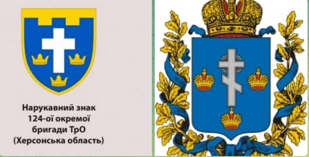 Так, на данный момент в Украине проходят очередные военные учения. На сей раз тренируются отряды территориальной обороны. Напомним, что президент Зеленский ввёл понятие «добровольной территориальной общины» — это бригады военных из числа добровольцев, которые формируются специальным указом главы государства в каждой области с целью потенциальной широкомасштабной партизанской войны с агрессором. Видимо, в честь учений наконец-то были приняты оригинальные нарукавные эмблемы для каждого воинского соединения. На вид всё здорово, но зрада, как всегда, подкралась откуда не ждали. Сообщается, что нарукавный знак 124-й отдельной бригады теробороны Херсонщины подозрительно напоминает аналогичный герб, который когда-то имел данный регион. Это герб Херсонской губернии времён Российской Империи. Мы можем наблюдать христианский крест (кстати, по стилистике он ближе к протестантскому, нежели к православному), а также сочетание жёлтого и голубого цветов и три короны. А теперь просто взгляните на герб Херсонской губернии и, как говорится, найдите 10 отличий. Фото: Klymenko Time То есть, никто не отрицает, что сходство не один в один – однако оно видно невооружённым взглядом и очень бросается в глаза. Интересно, означает ли это определённую преемственность с имперской Россией – или авторы просто не заметили/не сочли важным такое совпадение? Без специальной комиссии тут точно не разберёшься! «В лазуревом щите, серебряный русский крест, с сиянием в четырёх верхних углах, сопровождаемый в верхних углах и снизу тремя золотыми императорскими коронами. Щит увенчан императорскою короною и окружён золотыми дубовыми листьями, соединёнными Андреевскою лентою», — так описывается герб Херсонской губернии на одном из сайтов, посвящённых имперской геральдике. Короче – очередная зрада! Ранее мы писали о новых «военных законах» Зеленского. Понравился материал? Поставьте ему 5 звезд. Это важно для автора.