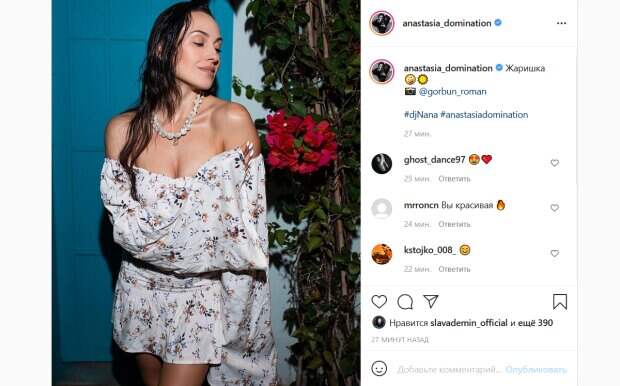 net, на этот раз она показала образ, который отлично подойдет для знойного лета. Так, на новом фото Кумейко позирует в очень коротком белом платье-тунике с цветочным принтом и открытыми плечами. Исполнительница опустила наряд пониже, делая его декольте еще более вызывающим. Образ артистки дополнили маникюр с белым лаком и стильное ожерелье. Волосы Анастасия оставила распущенными, при этом они выглядели слегка влажными. Для снимка исполнительница замерла в томной позе и легонько улыбнулась. «Жаришка», - коротко подписала фото Кумейко. Ее поклонники тут же отреагировали на публикацию. «Вы красивая», «Знойная женщина», «Огонь», «Вау», - пишут люди. Ранее мы писали, что Анастасия поделилась новым снимком, на котором запечатлена лежа в интересном месте на пляже в Турции. Перед камерой она появилась в смелом образе – крошечном сером бикини на тонких веревочках, поверх которого накинула белую рубашку оверсайз. Ее волосы небрежно уложены, а на лице легкий макияж и безмятежный вид. Напомним, экс-Nikita Кумейко в узком боди впечатлила провокационной позой: "Огромное желание...". Как сообщала Politeka, экс-Nikita Кумейко в мини-бикини вытянула ножки, радуя глаз: "Просто пушка". Также Politeka писала, что экс-Nikita Кумейко в смелом бикини показала фигуру на зависть всем девушкам: "Богиня".
