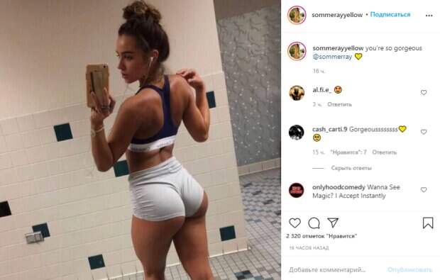 Американская фитнес-модель Соммер Рэй восхитила домашним видом в топе и коротеньких шортиках Молодая знаменитость делится новыми фото довольно активно, ведь всегда старается прорекламировать одежду, которую начала выпускать после открытия своего магазина. Спортсменка активно подчеркивает формы коротенькими топами, лосинами и шортами, а также демонстрирует лично на себе, как выглядит ее одежда для фитнес-красоток.