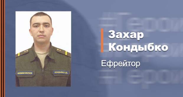 Мужество, самоотверженность и высочайший уровень подготовки ефрейтора Захара Кондыбко, уничтожившего в бою двенадцать украинских неонацистов, позволили одержать победу и сохранить жизни российских военнослужащих в ходе выполнения спецоперации по освобождению Донбасса и денацификации Украины. Об этом 30 ноября сообщила пресс-служба Минобороны РФ.