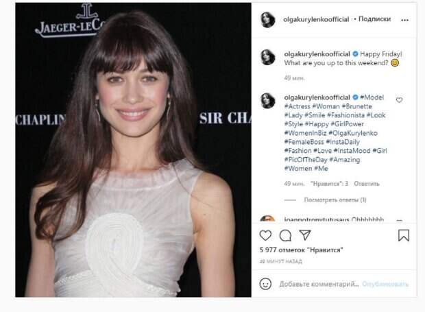 Пятница не стала исключением. Красотка решила поделится фото, где она была в полупрозрачном платье, позируя на фоне фотозоны. Девушка смеялась, радуя своей улыбкой. "С пятницей! Что ты делаешь на этих выходных?", - написала Куриленко под фото. Фанаты поставили более 5 тысяч лайков и написали комментарии: "Ох", "Улыбайся красиво", "Красивая брюнетка", "Привет, фантастической недели красивой", "Счастливой пятницы", "Поздравляю с пятницей", "У нее прекрасная улыбка", "Богиня". Мы писали, что популярная актриса Ольга Куриленко поразила пикантным видом в тесном корсете. На Оле красовался серебристый корсет, который едва прикрыл ее пышные прелести. Яркий макияж и черные длинные перчатки делали Куриленко похожей на женщину-вамп. Она приоткрыла рот, добавив особого шарма образу. Напомним, украинская девушка Бонда Куриленко в надменной позе впечатлила изгибами А еще Politeka писала, что украинская девушка Бонда Куриленко взволновала видом в невидимом платье Также Politeka сообщала, что украинская девушка Бонда Куриленко похвасталась блестящей шевелюрой, каждая девушка о такой мечтает