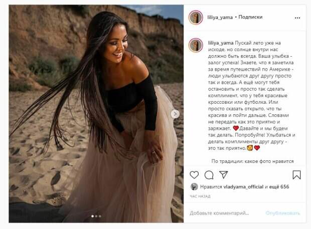 На втором фото жена танцора уже присела, повернувшись в профиль к камере, делая снимок очень нежным. Третий кадр получился почти аналогичным, но это не помешало ему быть по-своему увлекательным. Об этом пишет Politeka.net со ссылкой на страничку знаменитости. "Пускай лето уже на исходе, но солнце внутри нас должно быть всегда. Ваша улыбка - залог успеха! Знаете, что я заметила за время путешествий по Америке - люди улыбаются друг другу просто так и всегда. А ещё могут тебя остановить и просто так сделать комплимент, что у тебя красивые кроссовки или футболка", - написала Лиля. Фанаты, включая мужа Влада, поставили почти 700 лайков и написали комментарии: "Улыбаюсь и говорю, что Ты САМАЯ КРАСИВАЯ!", "Даже не знаю. Но если выбирать, то мне фото", "Все фото по своему прекрасны. К сожалению менталитет нашего народа к этому не совсем готов. Хотя всякое бывает в жизни)", "Лиля, Вы такая красотка! Такая светлая, стильная, вкусная!Счастья Вам!", " мне нравятся все фотки, вы красивая, я вам лично не знаю, но мне кажется что вы ещё и добрый и позитивный человек", "Лиля вам бесконечно можно говорит что вы красивая .Вы невероятно очаровательная Вы БОГИНЯ!". Напомним, застывший в воздухе Влад Яма показал, что любит делать наедине Также Politeka писала, что суровый Влад Ямы напугал видом без одежды, таким звезду мало кто видит А еще Politeka сообщала, что лысый Влад Яма в очках похвастался неожиданным образом