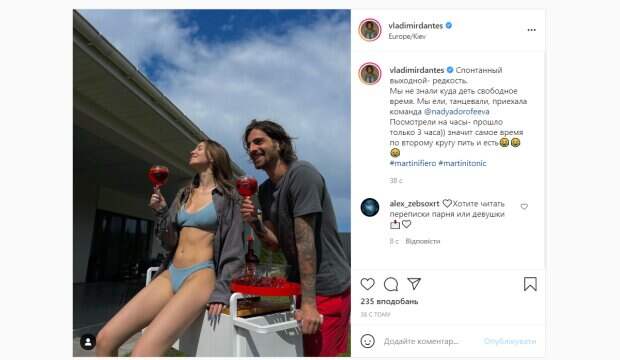 Владимир Дантес показал снимки, как они с Надей Дорофеевой проводят свое воскресенье Как сообщает Politeka.net, известный украинский исполнитель, тренер "Лиги Смеха" и муж певицы Нади Дорофеевой Владимир Дантес часто радует публику яркими и забавными публикациями в своем Instagram. Так, в этот раз Вова похвастался в соцсети, как легко и непринужденно проводят с Надей выходные с бокалами в руках.