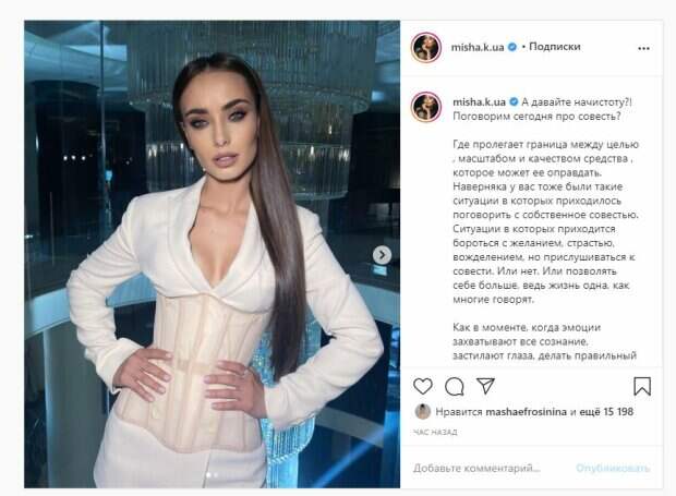 Звезда показала себя максимально близко и во весь рост. Об этом пишет Politeka.net со ссылкой на страничку знаменитости. "А давайте начистоту?! Поговорим сегодня про совесть? Где пролегает граница между целью , масштабом и качеством средства , которое может ее оправдать. Наверняка у вас тоже были такие ситуации в которых приходилось поговорить с собственное совестью. Ситуации в которых приходится бороться с желанием, страстью, вожделением, но прислушиваться к совести. Или нет. Или позволять себе больше, ведь жизнь одна, как многие говорят", - написала Мишина. Фанаты поставили более 15 тысяч лайков и написали комментарии: "Грех быть такой красивой", "Вау, шикарная", "Обожаю", "Мне моя совесть, в нашем мире, мешает жить", "Просто напоминаю себе, что чужая боль воздастся обидчику вдвое больнее... Не люблю боль из-за глупости... Такая вот мотивация...", "Она тут на себя не похожа", "Божественна". Напомним, «Холостячку» Ксению Мишину спутали с Анджелиной Джоли, сходство поражает А еще Politeka писала, что "Холостячка" Мишина в прозрачном наряде показала, чем будет покорять знойных красавцев Также Politeka сообщала, что «Холостячка» Мишина довела до мурашек чувственными образами из нового шоу
