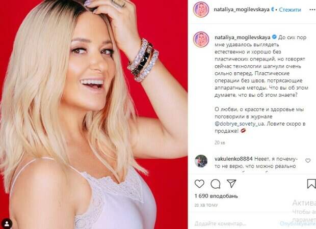 Пластические операции без швов, потрясающие аппаратные методы. Что вы об этом думаете, что вы об этом знаете?» - говорится в сообщении. Уточним, что на фотографии Могилевская позирует полубоком в белой майке, даря поклонникам идеальную улыбку. «Не превращайтесь в Билык!", "Вы и без пластических операций шикарно выглядите», «Нееет, я почему-то не верю, что можно реально чего-то добиться и без последствий. Обязательно что-то натворят или побочка после вылезет