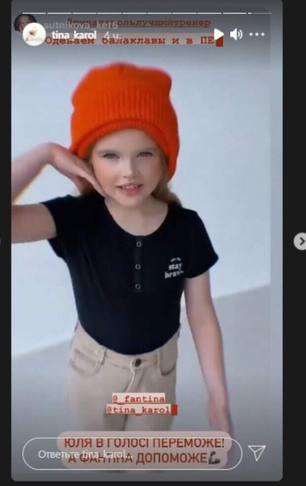 Наверно, поэтому певица часто приглашает Катю принять участие в рекламе своего мерча. Несмотря на юный возраст, мини-копия Кароль уже снискала популярности в Сети. За девочкой в Инстаграм следят более 25 тысяч подписчиков. В этот раз Кароль не смогла пройти мимо забавных кадров, которые девочка выложила у себя в соцсети, и сделала репост. Катя повторила за Тиной ее образ в новом клипе на песню "Хороший парень". В частности, юная модель примерила оранжевую балаклаву. В подписи Сытникова пожелала любимой артистке победы в одиннадцатом сезоне шоу "Голос країни". "Тина Кароль - лучший тренер! Одеваем балаклавы и вперед за победой!", - подписаны кадры, а также: "Завтра "Голос країни"! Поддерживаю команду Тины Кароль и Юлии Тимочко". Стоит отметить, певица довольно часто радует фанатов кадрами со своей мини-копией. До этого она хвасталась юной красоткой, примерившей ее фирменные колготки с надписью "скандал" (такое же название у ее прежнего хита). Катя в пышном черном платье и стильном беретике сидела, согнув ножки в коленях, дабы можно было оценить в полной мере необычные колготки от Тины. Напомним, что девочка-копия Тины Кароль подросла и тоже решила "поскандалить", неожиданные кадры: "Ох уж. ..". Как сообщала Politeka, девочка-копия Тины Кароль подросла и стала еще красивее, певица в восторге: "Моя слабость...". Также Politeka писала, Кароль в боди и колготках устроила пожар раскрепощенной позой: «Тина, что ты творишь!».