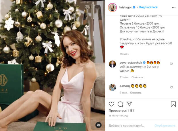 Кристина немного задрала подол, сверкнув стройными ножками, а также похвасталась фантастическим декольте, не надев бюстгальтера. Горняк заглянула в одну из коробочек под елкой, не скрывая своего восторга. "Дорогие мои, ну что, начнём-с!!!!!", - говорится в подписи. Девушка презентовала собственные наборы с косметическими средствами, которые намерена удачно продать. Одним из первых пост прокомментировал ее супруг. "