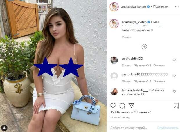 Так, сейчас на страницу красотки подписаны уже 11,6 миллиона человек. Новый снимок никак не мог оставить их равнодушными. Анастасия позировала, сидя на лавочке в смелом платье с огромным декольте. Пышные прелести едва ли не выпрыгивали из столь откровенного наряда. Кроме того, тонкие бретельки придавали пикантности, еле держась на плечах. Модель подчеркнула тонкую талию и пышные бедра обтягивающей тканью, из-за чего получился искусительный изгиб. Завершали образ Квитко различные украшения и голубая сумочка. Почти за час пост собрал более 30 тысяч лайков и много комментариев. Пользователи сети пришли в восторг от образа модели и засыпали ее приятными сообщениями. "Боже мой, но какая красивая женщина у меня перед глазами