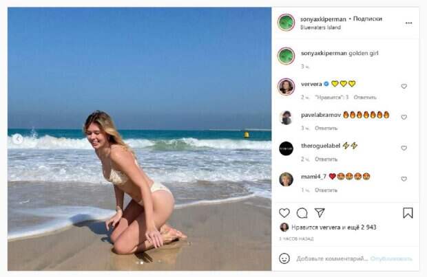 В этот раз Соня показалась в купальнике на берегу моря. Звезда выгнулась, демонстрируя каждый сантиметр своего тела. На втором фото Киперман уже сидела на коленках, наслаждаясь теплой погодой. "Золотая девушка", - написала Соня под фото. "Люблю", - написала сразу Вера Брежнева. Фанаты поставили почти 3 тысячи лайков и написали комментарии: "Да благословит Бог нашу золотую русалочку", "Соня, какая же красивая, а фигура", "больше похоже на шикарную девушку". Мы писали, что дочь известной певицы Веры Брежневой Соня Киперман показала фигурку в смелом наряде. Так, недавно Соня выложила в своем микроблоге очаровательный снимок, на котором запечатлена на прогулке, очевидно, кадр был сделан за границей. Об этом свидетельствует удивительная летняя локация и легкий наряд юной красотки. Напомним, дочки Брежневой превратились в настоящих моделей, впечатлив певицу своим видом А еще Politeka юная дочь Брежневой в коротком топе и без белья дала фору звездной мамочке Также Politeka сообщала, что юная дочь Веры Брежневой в "невидимом" бикини выставила напоказ безупречное тело