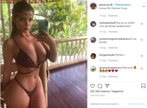 Длинные локоны Деми предпочла спрятать благодаря специальной укладке и аккуратному украшению с камнями и бусами на ее лбу, а лицо без макияжа не стала подчеркивать дополнительными уходовыми средствами. Как и всегда, главной изюминкой образа Деми стали ее пышные формы. «Зеркало, зеркало на стене...», - загадочно подписала новый кадр Деми. Вот как реагируют поклонники: «Так хорошо 🔥🔥🔥», «😍😍😍❤️Красивая ❤️❤️❤️ Ты такая красивая 💞💞💞💞», «Que hermoso frente», «Кто любит тебя, кроме парня из камары?», «Te vez muy espectacular. Quiero comerte a besos mi vida», «Такая шикарная малышка👏👏❤️❤️🔥😍», «💘 твой наряд», «Эта дамочка разбивает сердца💖💖💖», «Ангел ❤️», «Я не скажу здесь, насколько сильно этот возбуждающий образ вас влияет на мой дух, только если вы спросите», «❤️🔥😍 очень хорошо выглядит». Каждый день звезда старается пополнять свой профиль в Инстаграм жаркими фото, чтобы поддерживать свою популярность в сети и привлекать еще больше аудитории к профилю. Причем делает это Деми излюбленным образом - публикуя жаркие снимки, на которых позирует в белье или купальниках. Модель с пышными формами сотрудничает с многими популярными брендами, поэтому удивлять каждый раз новым образом ей не составляет труда. Не так давно Роуз также блеснула загорелым телом в бикини с леопардовым принтом, которое едва выдержало "напор" девушки. Потянув за тоненькую ниточку на груди, звезда впечатлила жарким видом. «Привет, красотка, ты великолепно выглядишь ♥ ️ великолепная ♥ ️ милая ♥ ️ сексуальная 😘😘😘💕💕💕», «Ваша красота несравненная bbita», «Кошечка дразнится 😘😘😘», «Безумно красивая», «Красиво 😍», «все фото потрясающие красивые», «Уфффф, как ты богата на дыньки 😘😘💕», «Ummmmm.qv милое сердце», «😻😻😘❤️❤️🔥🌞Красивая и великолепная с любой стороны 😍🥰😘😘😘,» - пишут пользователи. Напомним, Деми Роуз едва удержала пышных «близняшек» в крохотном наряде. Как сообщала Politeka, бесстыжая Деми Роуз сбросила лифчик и показала, как веселится у озера. Также Politeka писала, что влажная Деми Роуз вышла из душа и без стыда блеснула формами