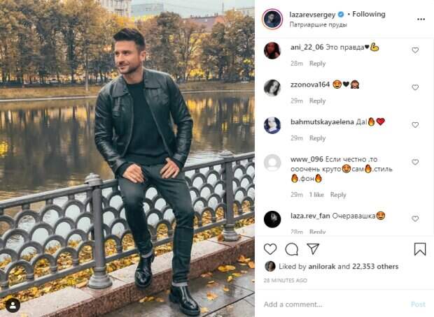 Популярный российский певец Сергей Лазарев впечатлил радостным осенним образом Как пишет Politeka.net, артист, которому приписывают роман с Ани Лорак, опубликовал в микроблоге "Инстаграм" новый снимок, ради которого выбрался на Патриаршие пруды в Москве. Сергей нарядился во все черное: свитшот, элегантные джинсы, кожанная куртка и лакированные ботинки.