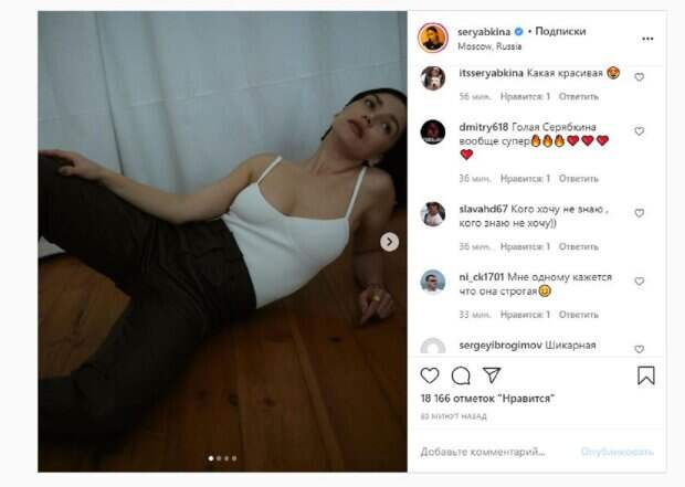 Об этом пишет Politeka.net со ссылкой на страничку знаменитости. "Настроение: Джимми Голспи из Улицы Ангела", - написала звезда. Фанаты поставили почти 20 тысяч лайков и написали комментарии: "Вставай, мать. Пора возвращаться в мир", "А мне нравится !!!", "Оль, ну какая же ты красотка, Люблю", "Боже Оленька ты Шикарная", "Ути пути, Оля, ты бьюти", "Ольга вы как всегда прекрасна", "Раздетая Серябкина, вообще супер", "Мне одному кажется что она строгая", "Используйте мой комментарий как лайк", "Надя Мейхер?", "Всегда такая неулыбчивая в жизни интересно", "Хорошо что дед тот до инсты не добрался". Мы писали, что известная певица Ольга Серябкина, бывшая солистка группы "Серебро", вскружила голову идеальными видами в платье. Артистка присела на лавочку, выставив вперед стройные и сияющие ножки. Большое декольте немного оголило грудь знаменитости. Тонкие бретельки держались на плечах, едва не соскальзывая. Напомним, экс-солистка "Серебро" засверкала аппетитными изгибами в полупрозрачном лифе А еще Politeka писала, что экс-солистка «Серебро» сверкнула сладеньким в вульгарном платье, засняв все крупным планом Также Politeka сообщала, что экс-солистка «Серебро» сверкнула сладеньким в вульгарном платье, засняв все крупным планом