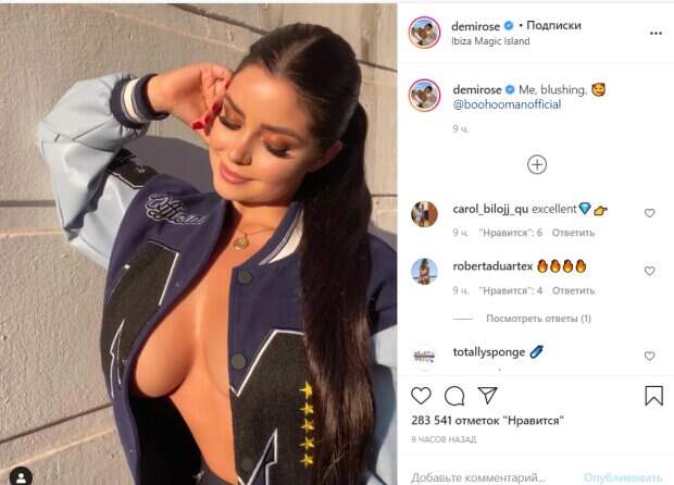 "Я застеснялась", - говорится в подписи к снимку. И с Роуз трудно в этом поспорить - было из-за чего. На опубликованном кадре Роуз предстала без бюстгальтера, выставив напоказ свою шикарную грудь. Единственным, что прикрывало ее внушительные формы была спортивна куртка. Публикация британской знаменитости вызвала сотни восторженных комментариев, а ее безупречные формы за несколько часов собрали более двухсот тысяч лайков. Деми покоряет интернет-пространство роскошными и дерзкими изгибами своего тела, которые она демонстрирует в рекламе нижнего белья и купальников. Не так давно, модель опубликовала снимок, на котором позировала на фоне моря и островов с яхтами. Она продемонстрировала безупречную фигуру в изящном купальнике, который максимально оголял ее пышную гордость. Напомним, Деми Роуз едва удержала пышных «близняшек» в крохотном наряде. Как сообщала Politeka, бесстыжая Деми Роуз сбросила лифчик и показала, как веселится у озера. Также Politeka писала, что влажная Деми Роуз вышла из душа и без стыда блеснула формами